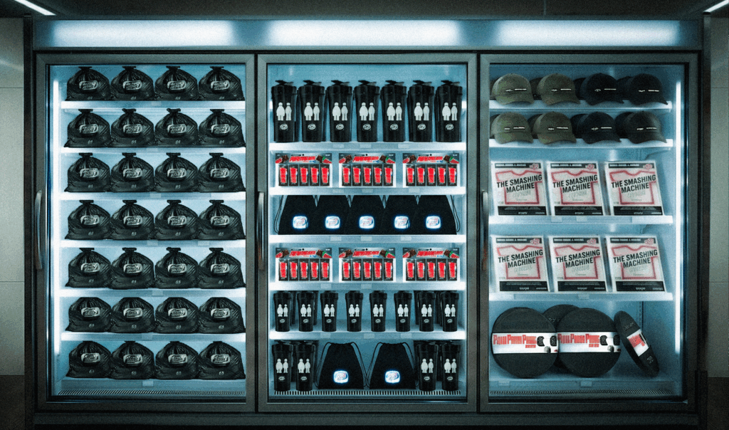 『スマッシング・マシーン』で描かれる総合格闘技の世界観に合わせてコンビニの内装を改造した本イベントでは、ダブルネームのアパレルのほか、プロテインバーやダンベルなど、限定コラボアイテムが多数登場。店内のコンビニレジカゴも5kgを超える重量級仕様で販売される。