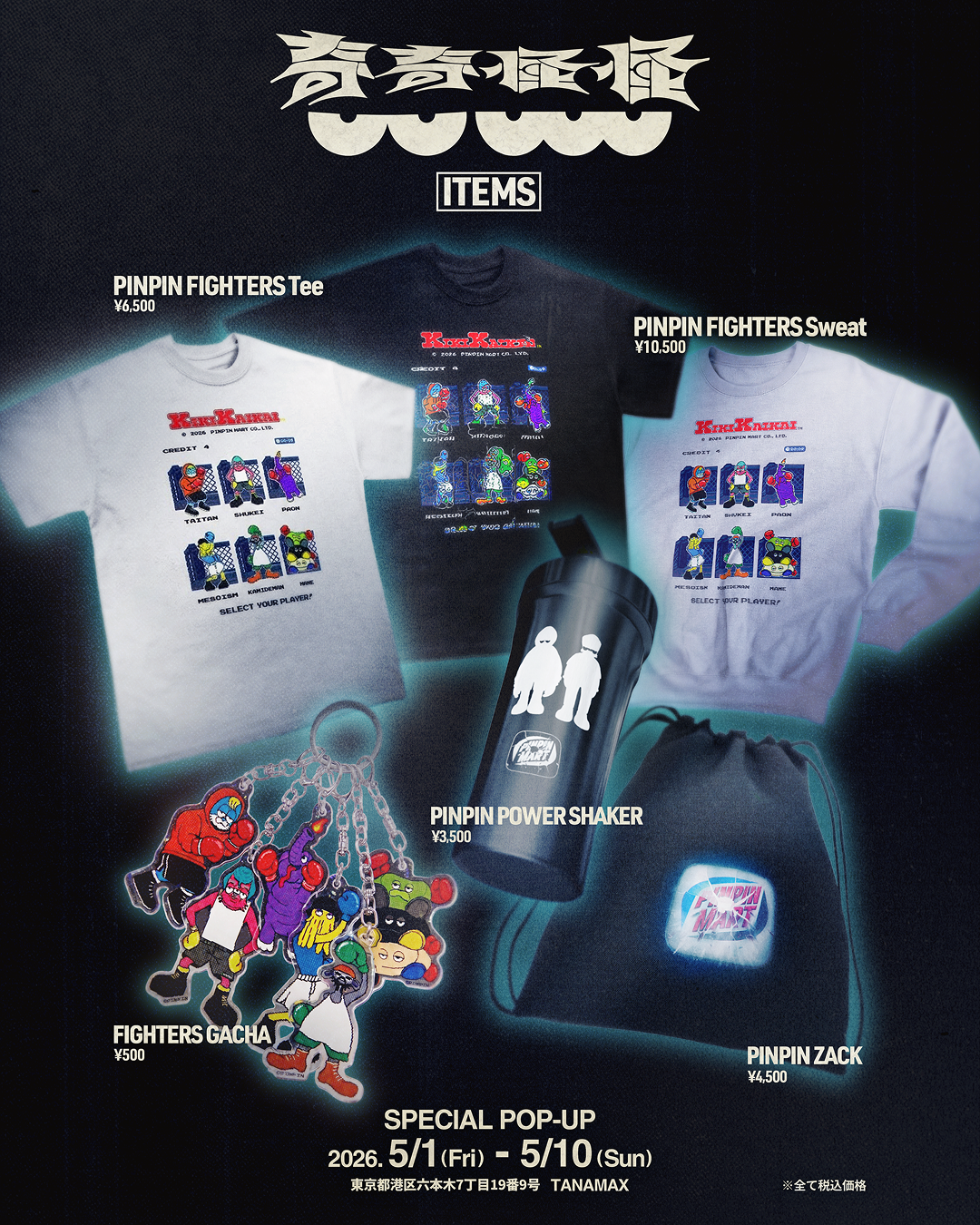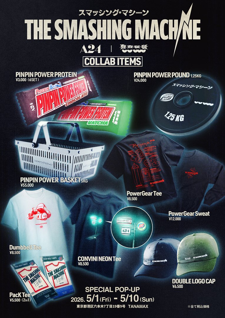 TaiTan(ラッパー・クリエイティブディレクター)と玉置周啓(MONO NO AWARE)によるPodcast番組『奇奇怪怪』と、日本で5月15日(金)に公開されるA24の映画『スマッシング・マシーン』がコラボレーションした期間限定ポップアップイベント「PINPIN POWER MART」が、六本木にあるポッドキャストスタジオ「TANAMAX」の1階にて、2026年5月1日(金)〜5月10日(日)の10日間限定で開催される。