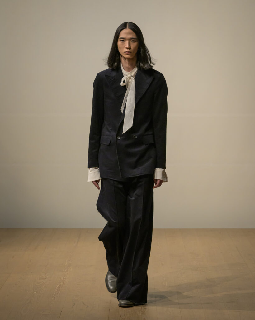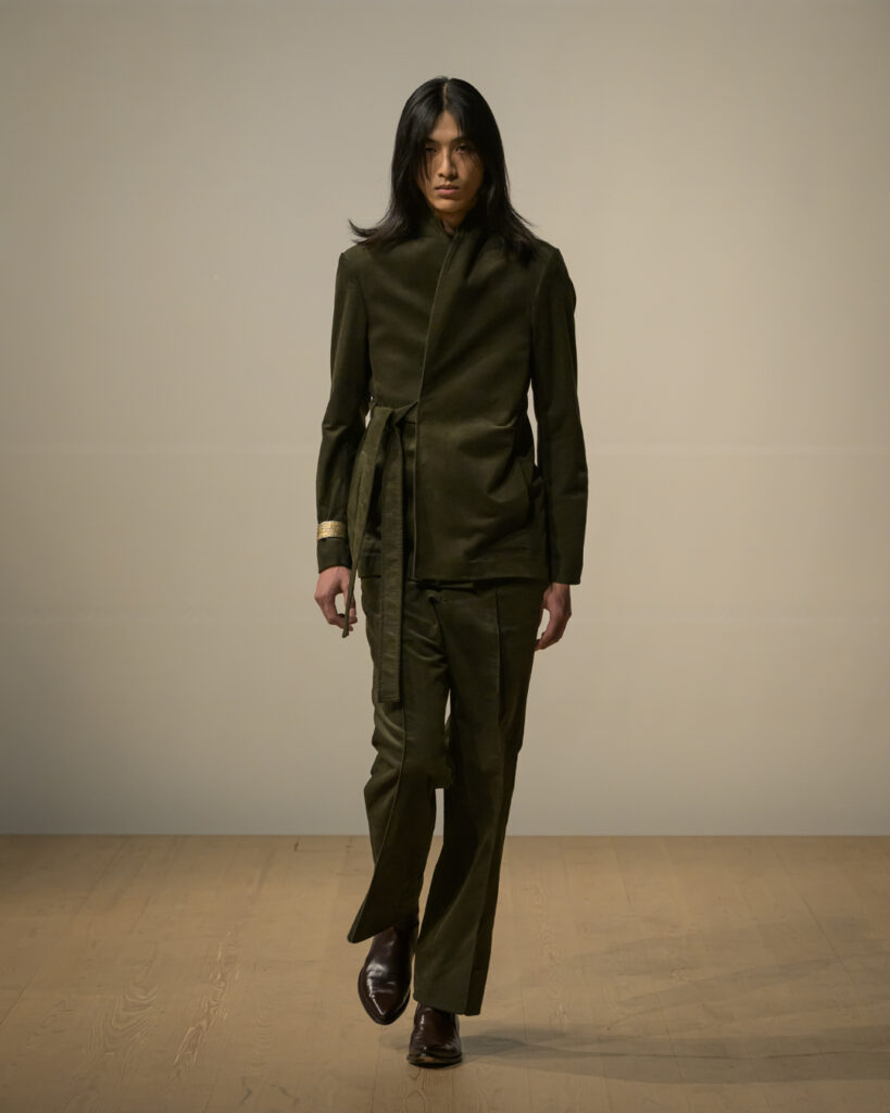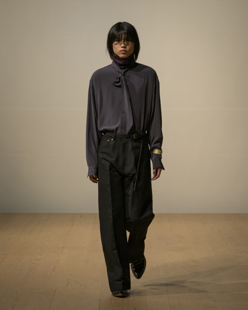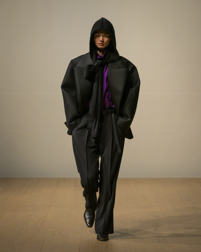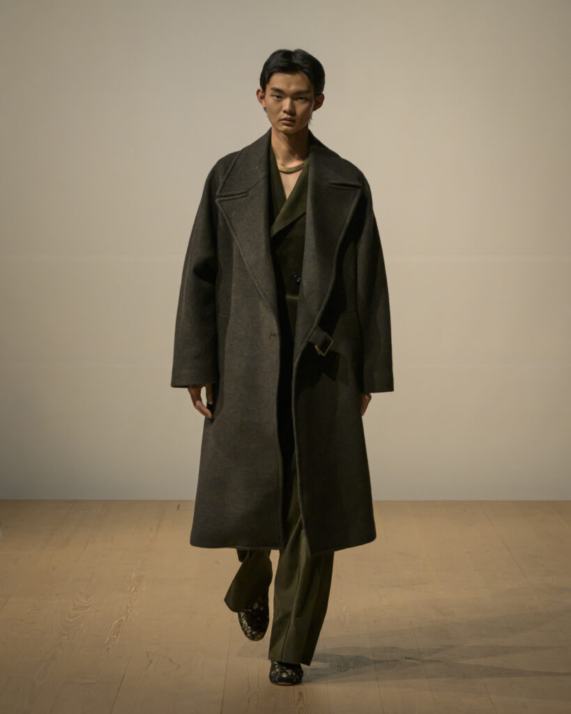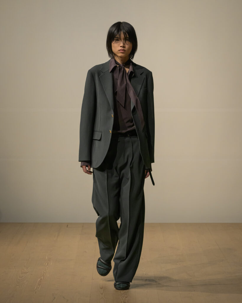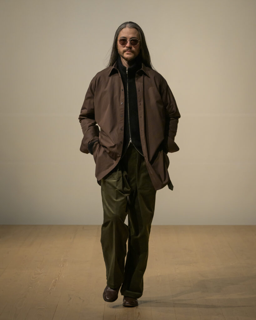 今回発表された2026年秋冬コレクションでは、黒を基調に白、深緑、茶、グレーを配したカラーパレットで和室の暗がりや障子の光、苔や木材・石の質感、漆器の反射など自然と建築に宿る陰翳を映し出し、紫を加えることでカラヴァッジョの劇的な色彩と京都を象徴する色彩を融合させた。