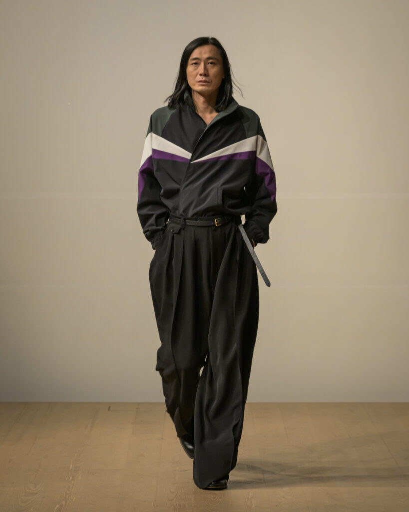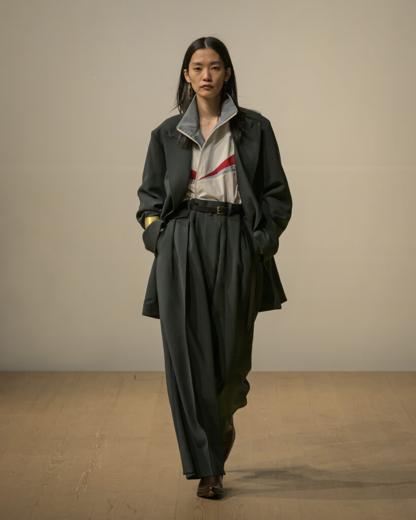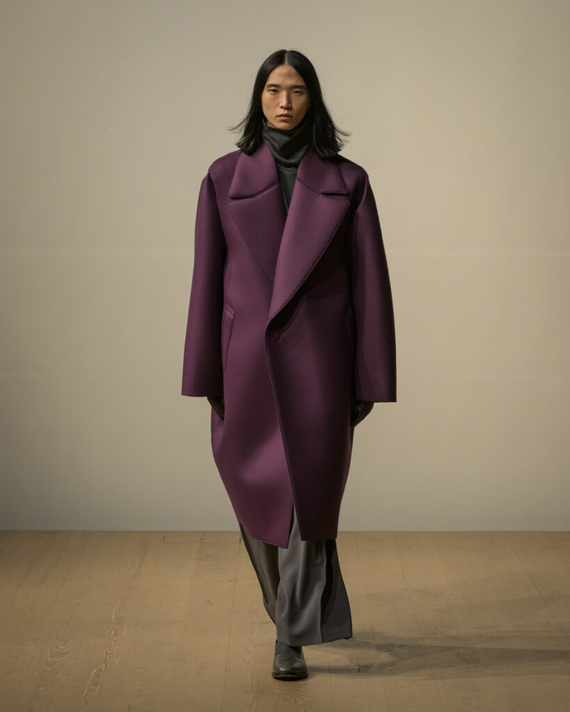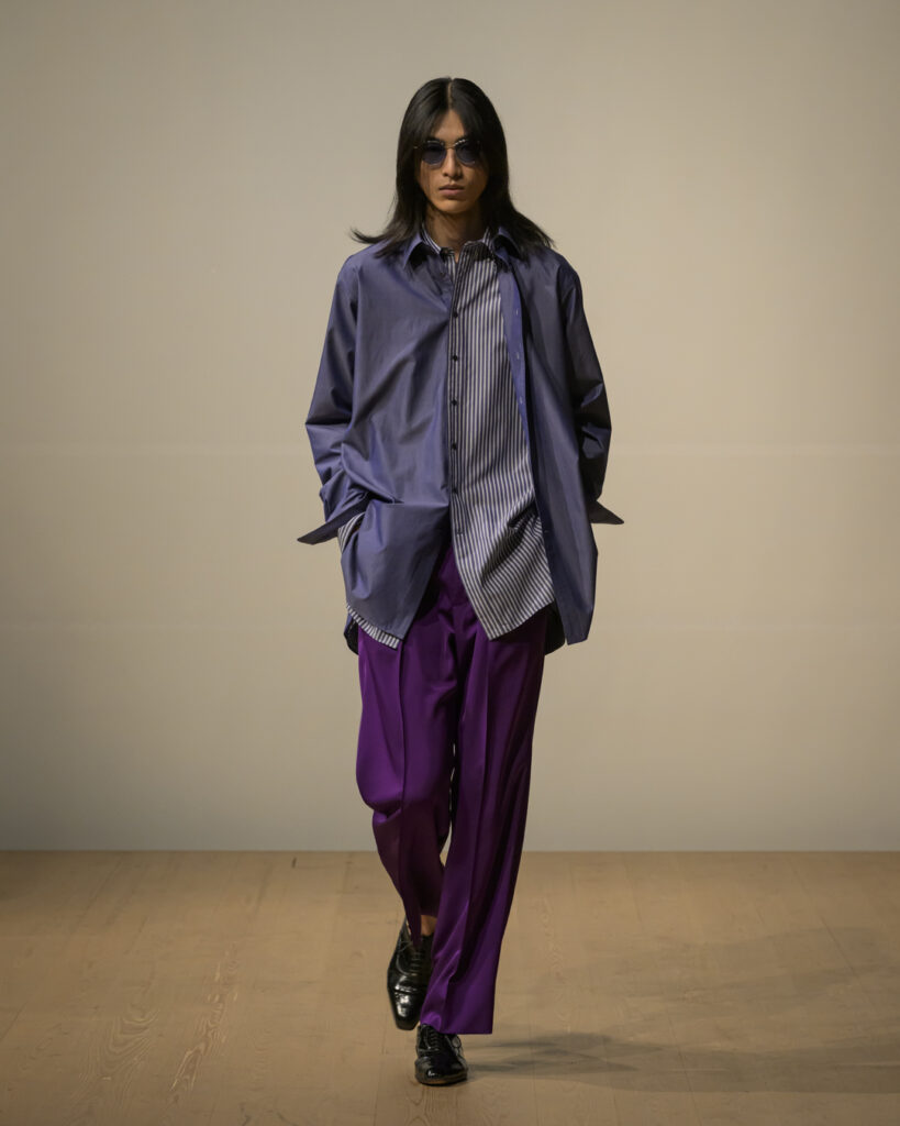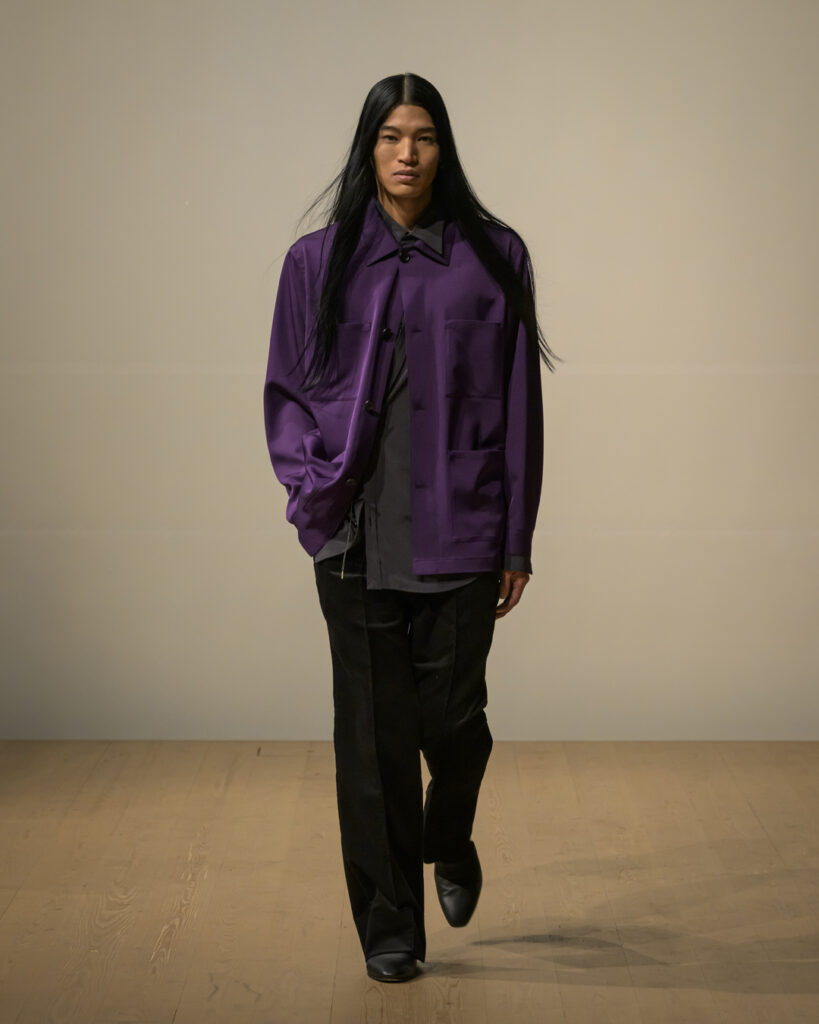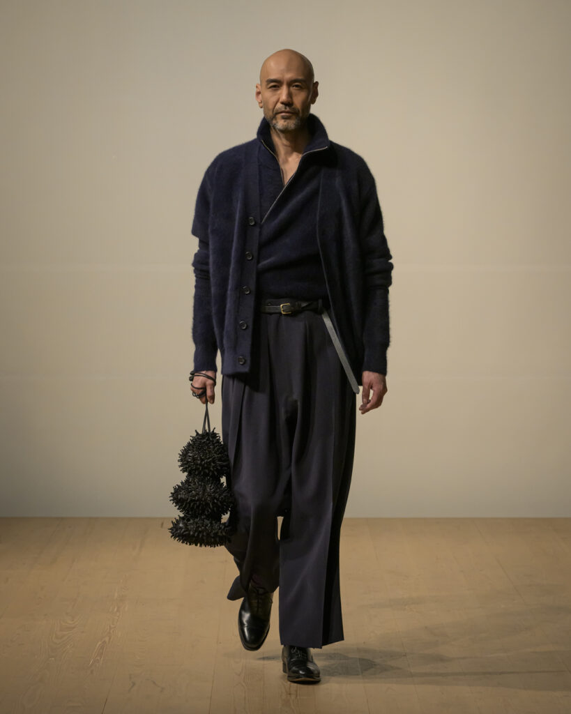 今回発表された2026年秋冬コレクションでは、黒を基調に白、深緑、茶、グレーを配したカラーパレットで和室の暗がりや障子の光、苔や木材・石の質感、漆器の反射など自然と建築に宿る陰翳を映し出し、紫を加えることでカラヴァッジョの劇的な色彩と京都を象徴する色彩を融合させた。