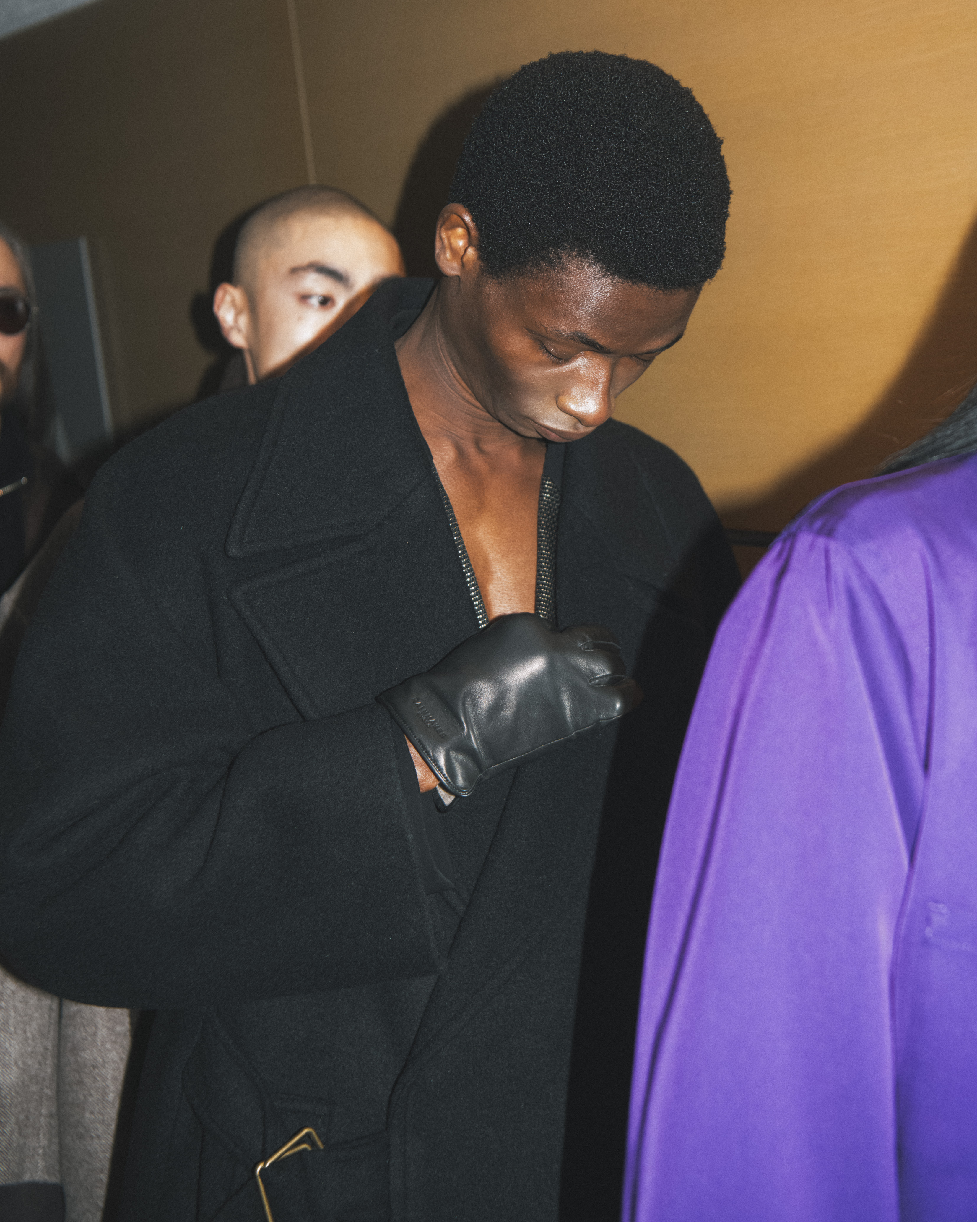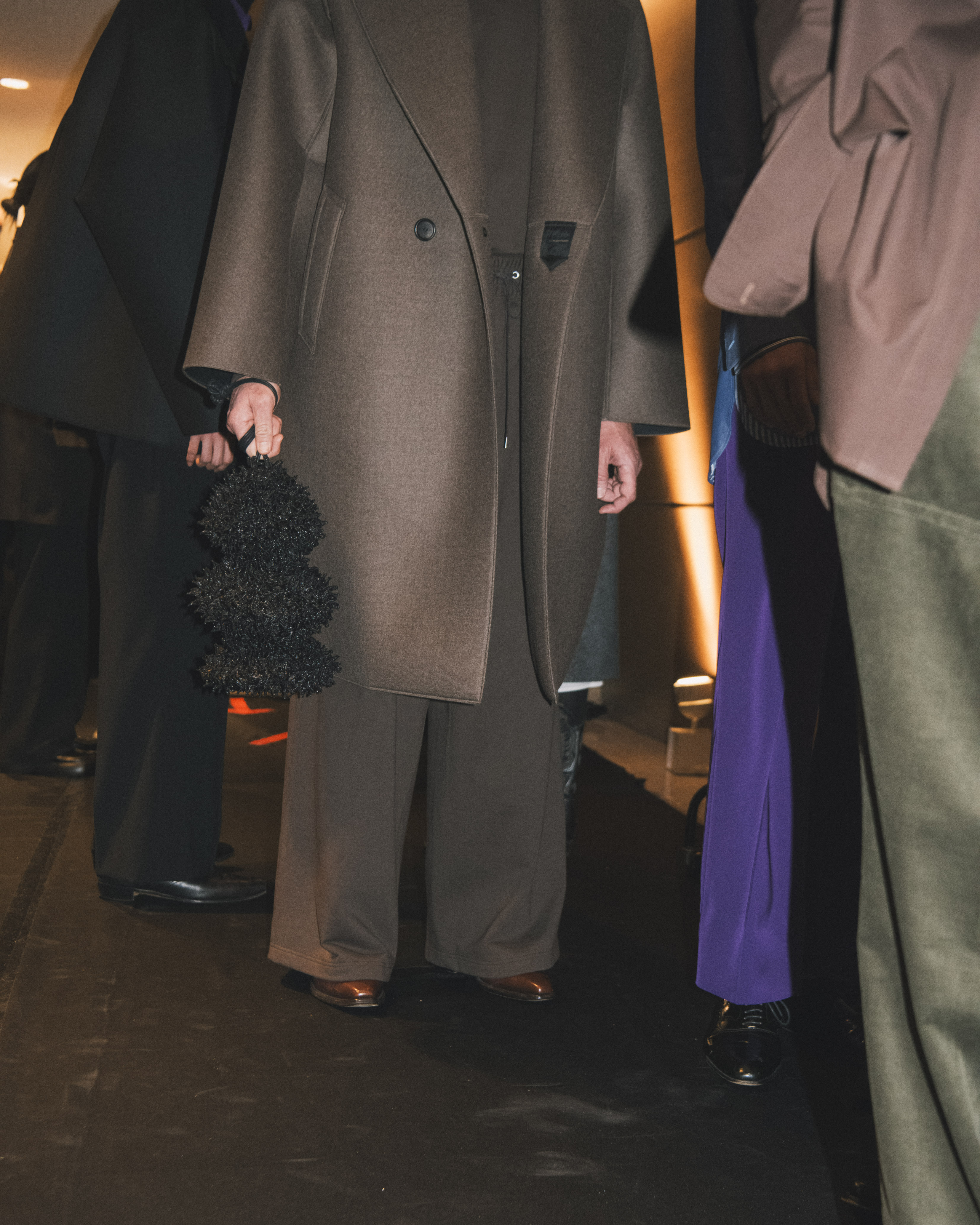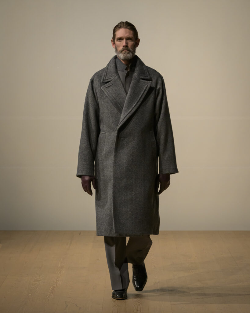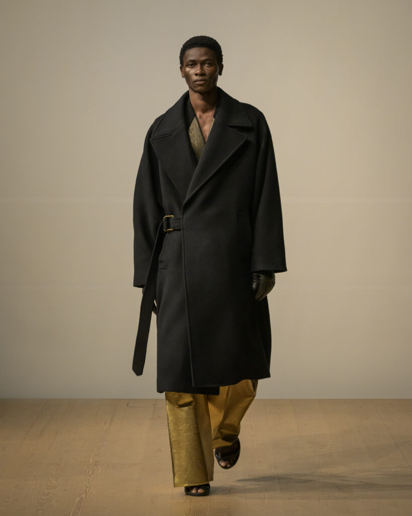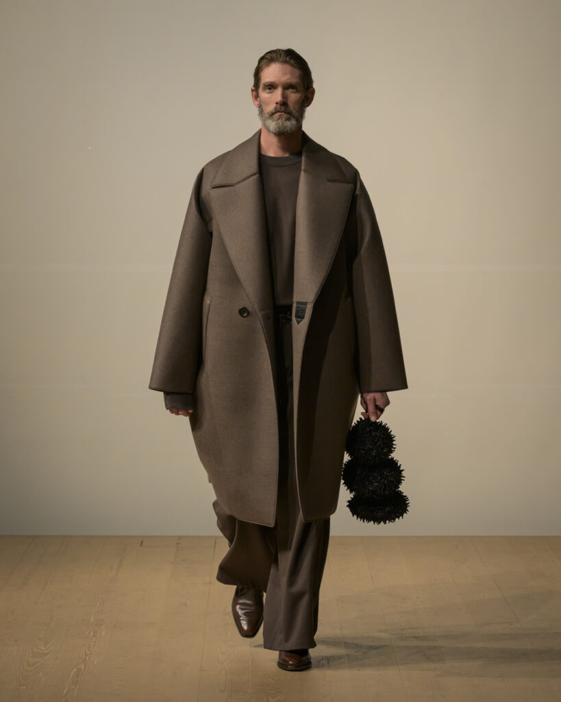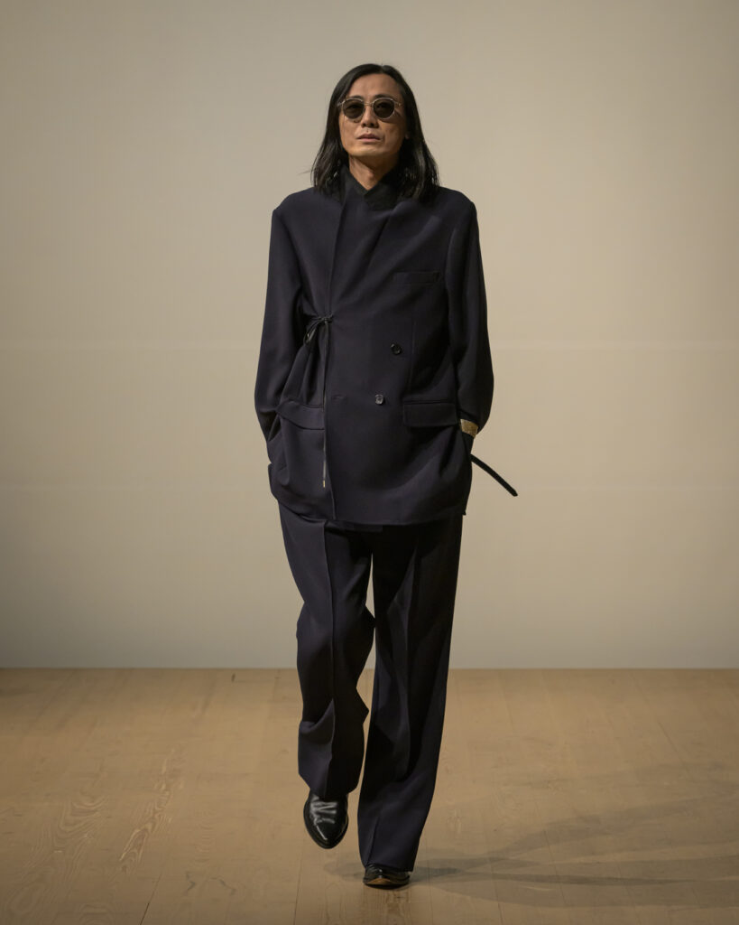 今回発表された2026年秋冬コレクションでは、黒を基調に白、深緑、茶、グレーを配したカラーパレットで和室の暗がりや障子の光、苔や木材・石の質感、漆器の反射など自然と建築に宿る陰翳を映し出し、紫を加えることでカラヴァッジョの劇的な色彩と京都を象徴する色彩を融合させた。