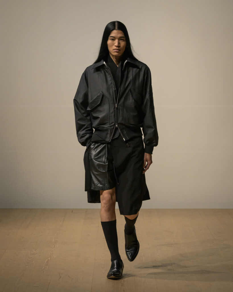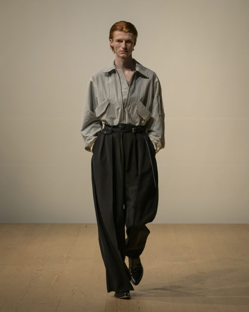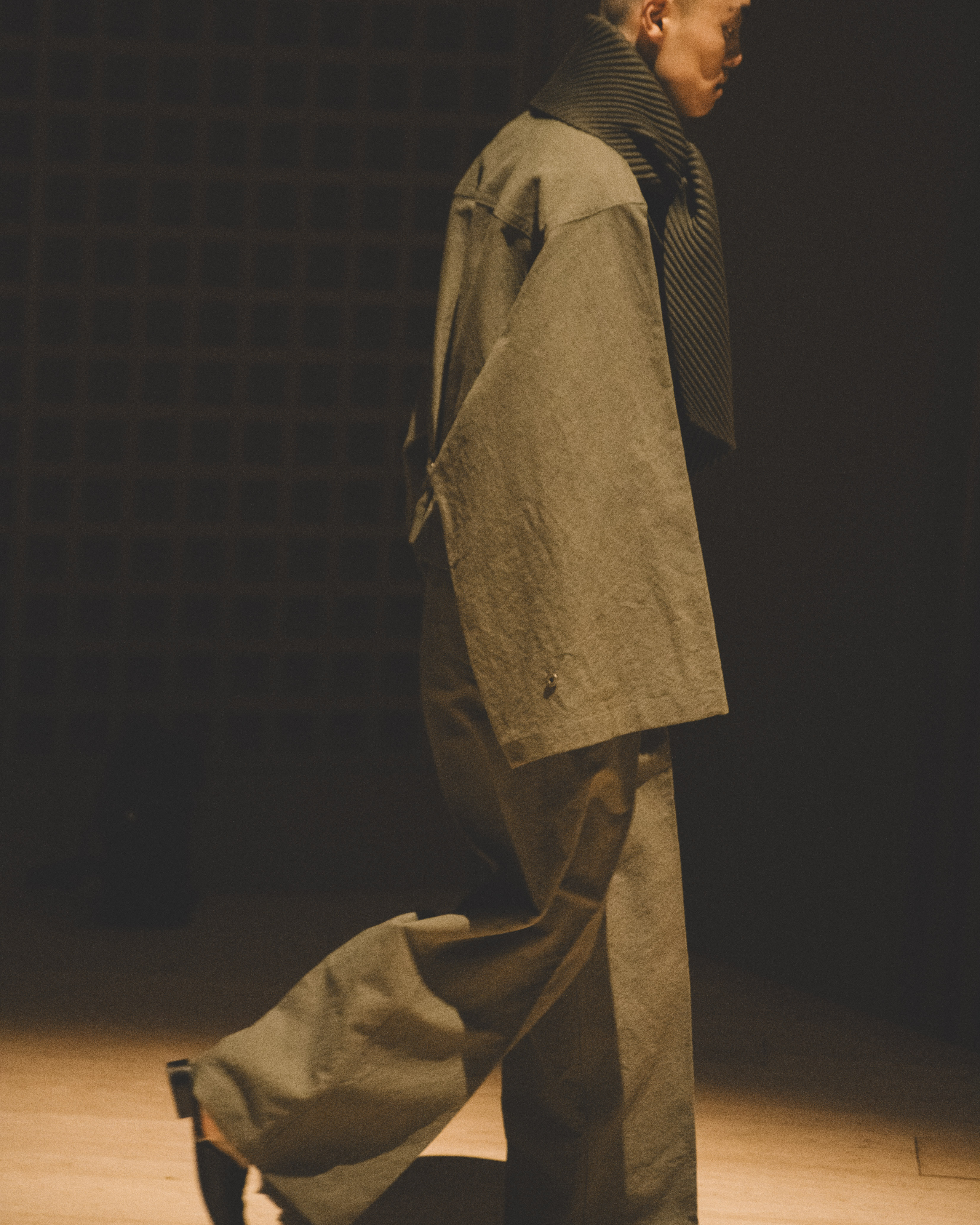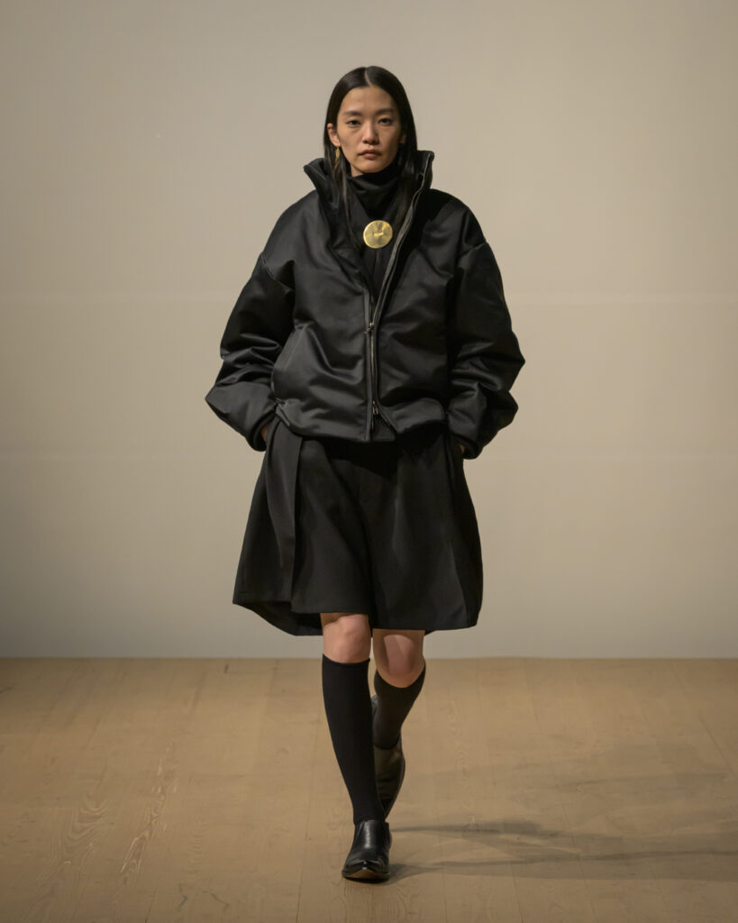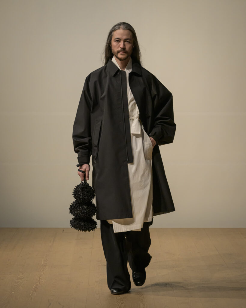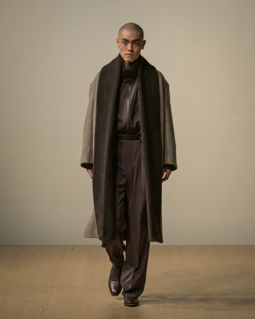 素材選びでは、光を反射するサテンやレザーと、光を吸収するウールやモールスキン、メルトンを対比させ、「光の反射」と「闇の吸収」を表現。透過性のある布地は障子越しの柔らかな光の陰影を衣服に落とし込んでいる。さらに造形においては、プリーツやタックによる深い影や、透過布の重ねによる「奥行きの影」を生み出し、直線裁ちの静けさとバロック衣装に通じる豊かなドレープを対比させることで「静」と「動」、「内」と「外」の共生を追求した。