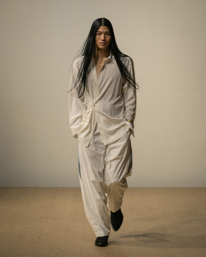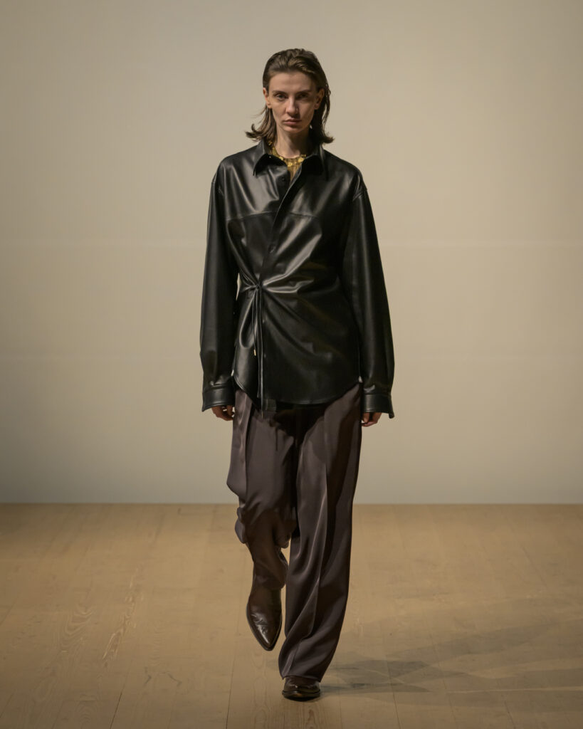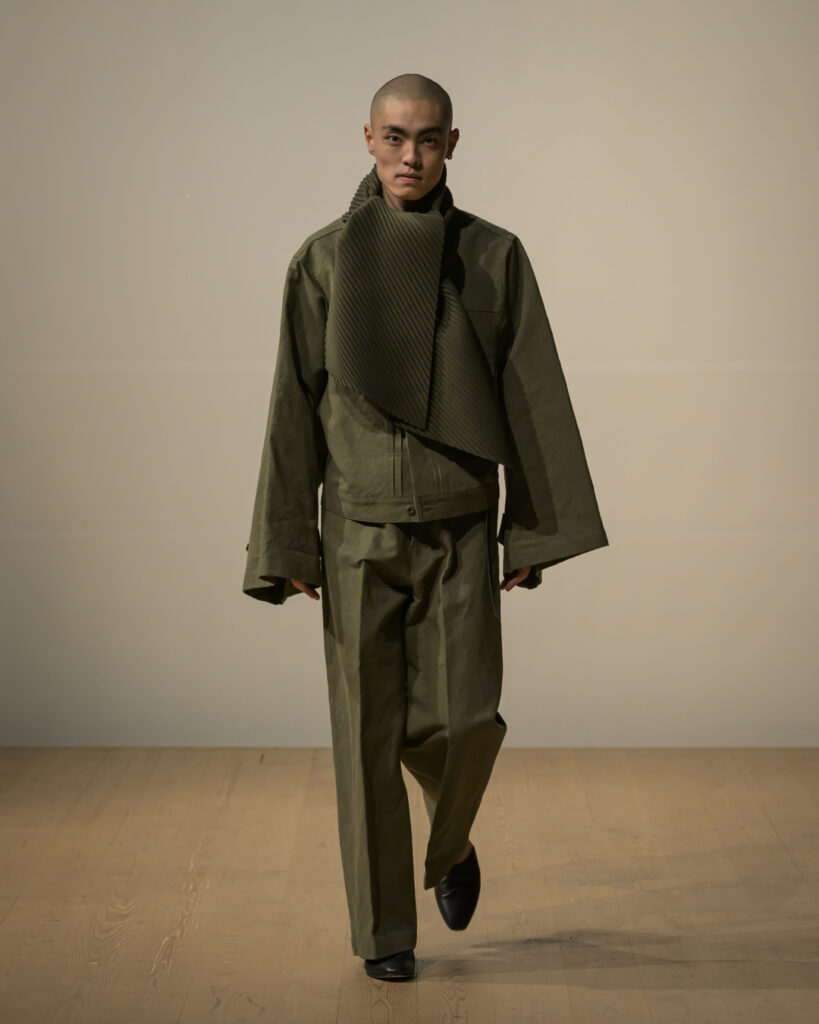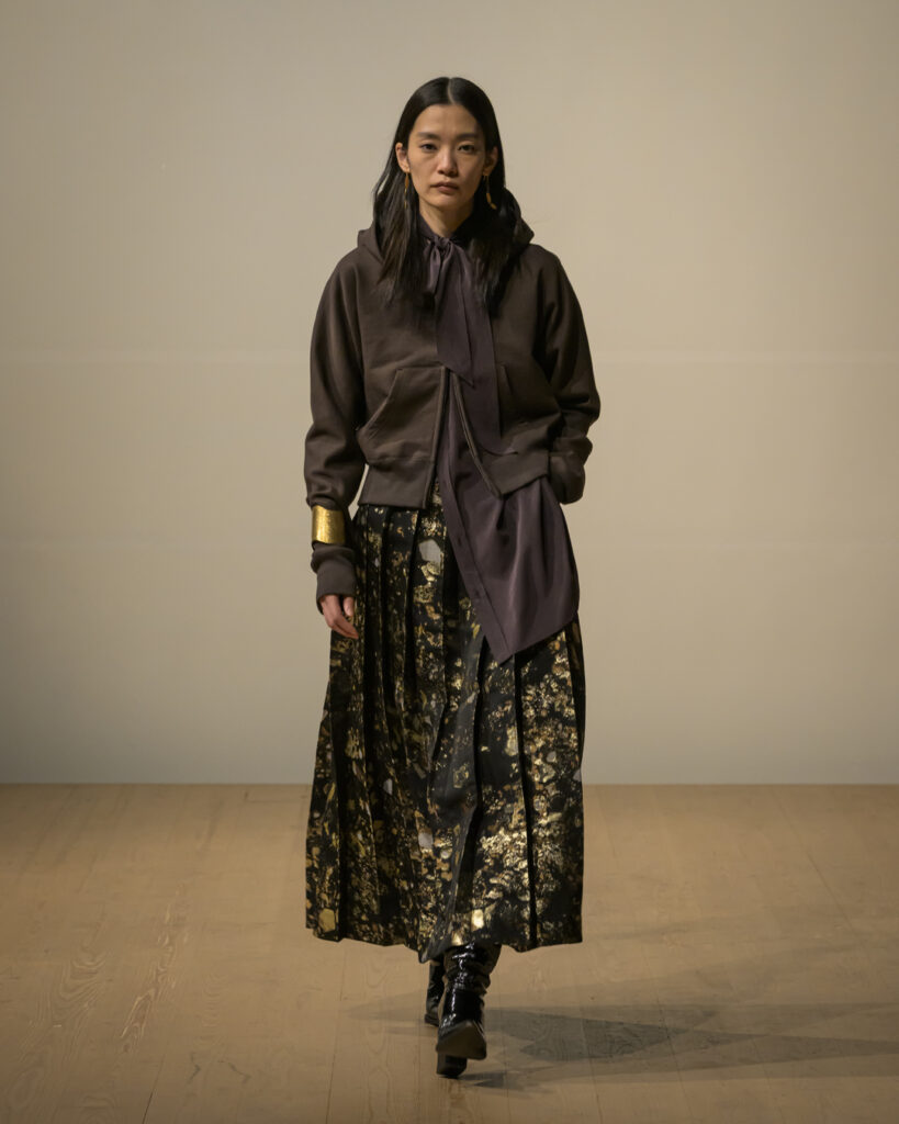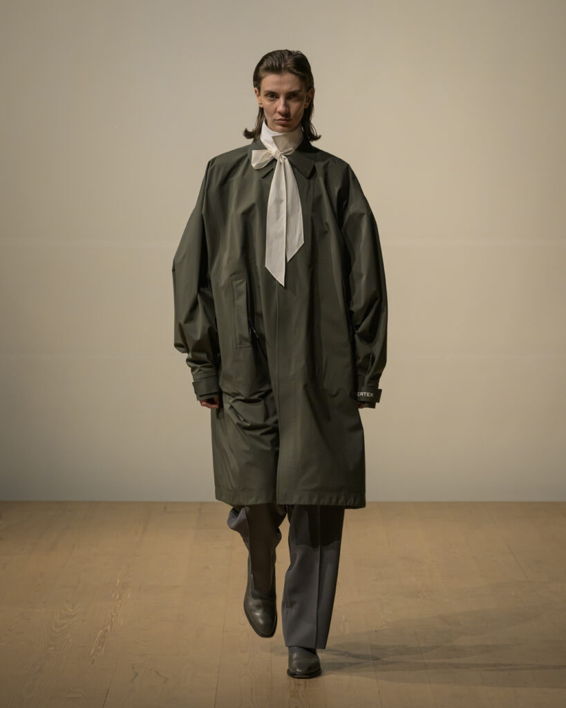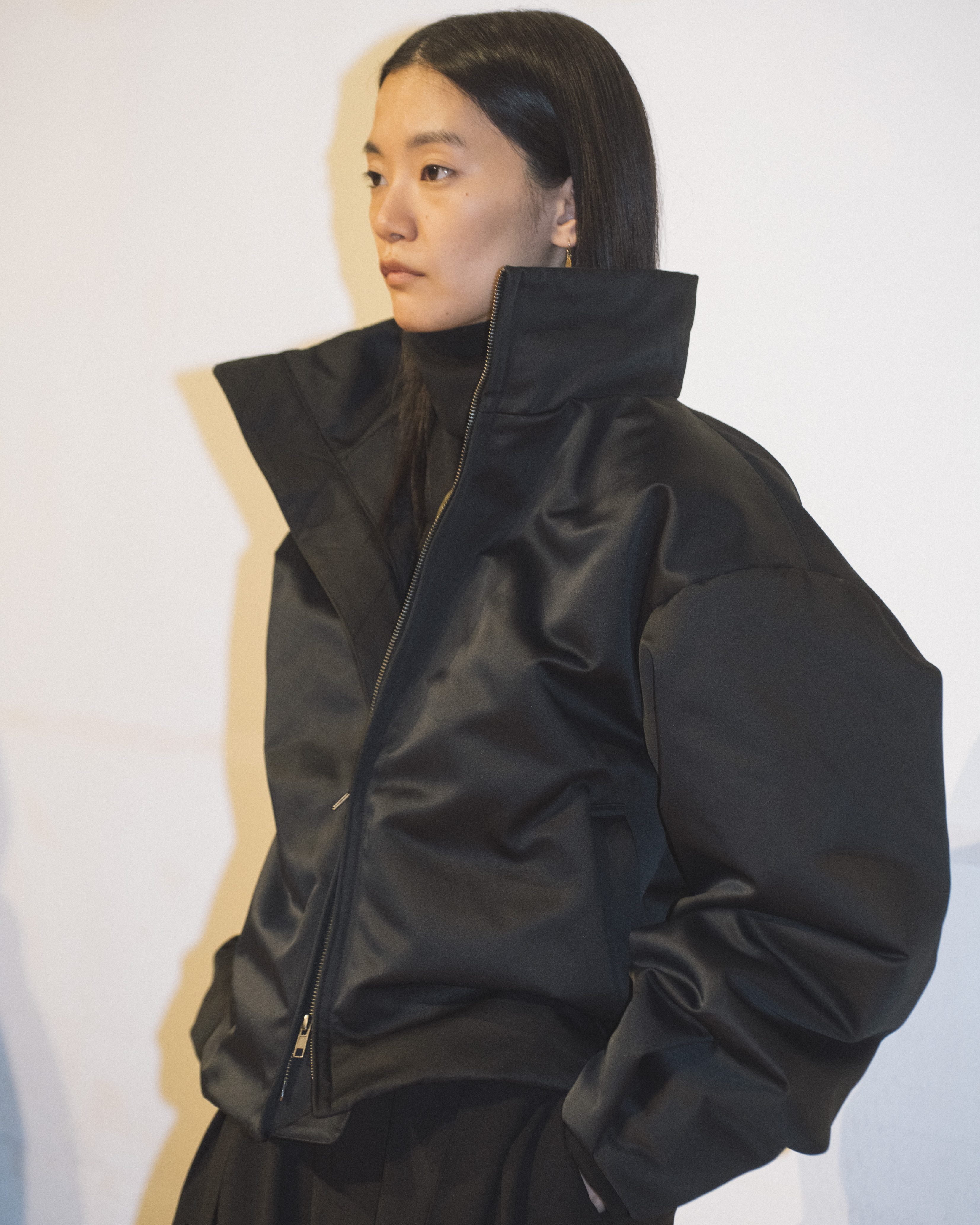 素材選びでは、光を反射するサテンやレザーと、光を吸収するウールやモールスキン、メルトンを対比させ、「光の反射」と「闇の吸収」を表現。透過性のある布地は障子越しの柔らかな光の陰影を衣服に落とし込んでいる。さらに造形においては、プリーツやタックによる深い影や、透過布の重ねによる「奥行きの影」を生み出し、直線裁ちの静けさとバロック衣装に通じる豊かなドレープを対比させることで「静」と「動」、「内」と「外」の共生を追求した。