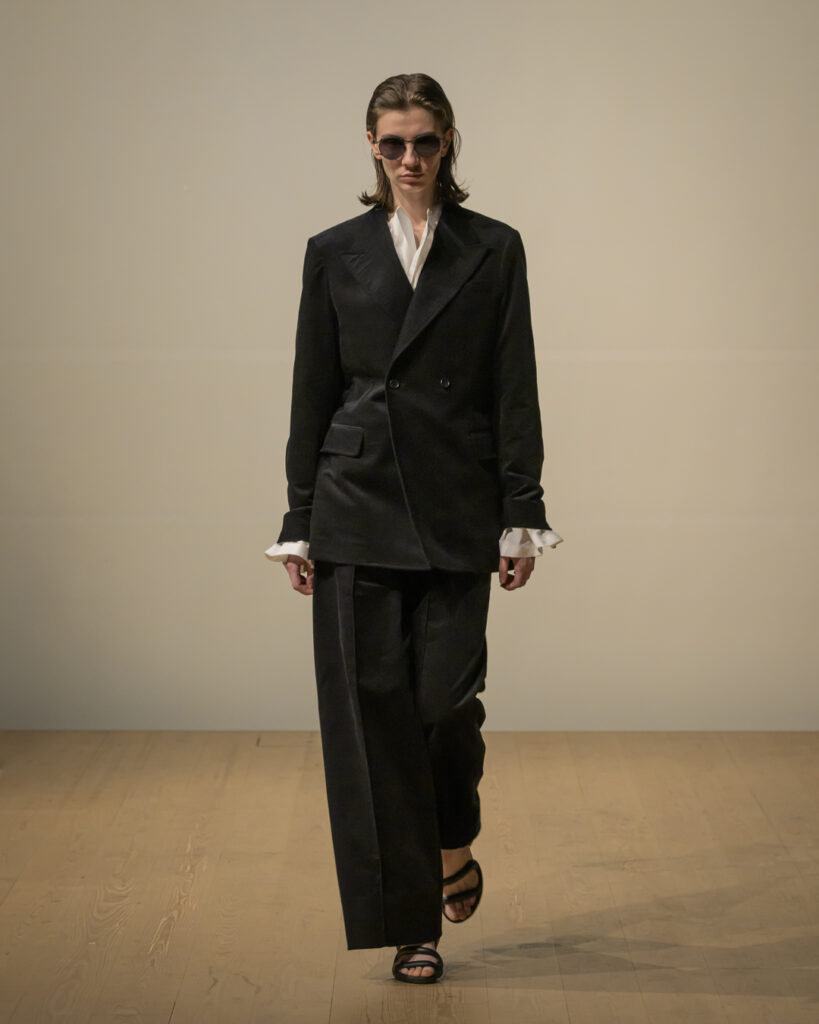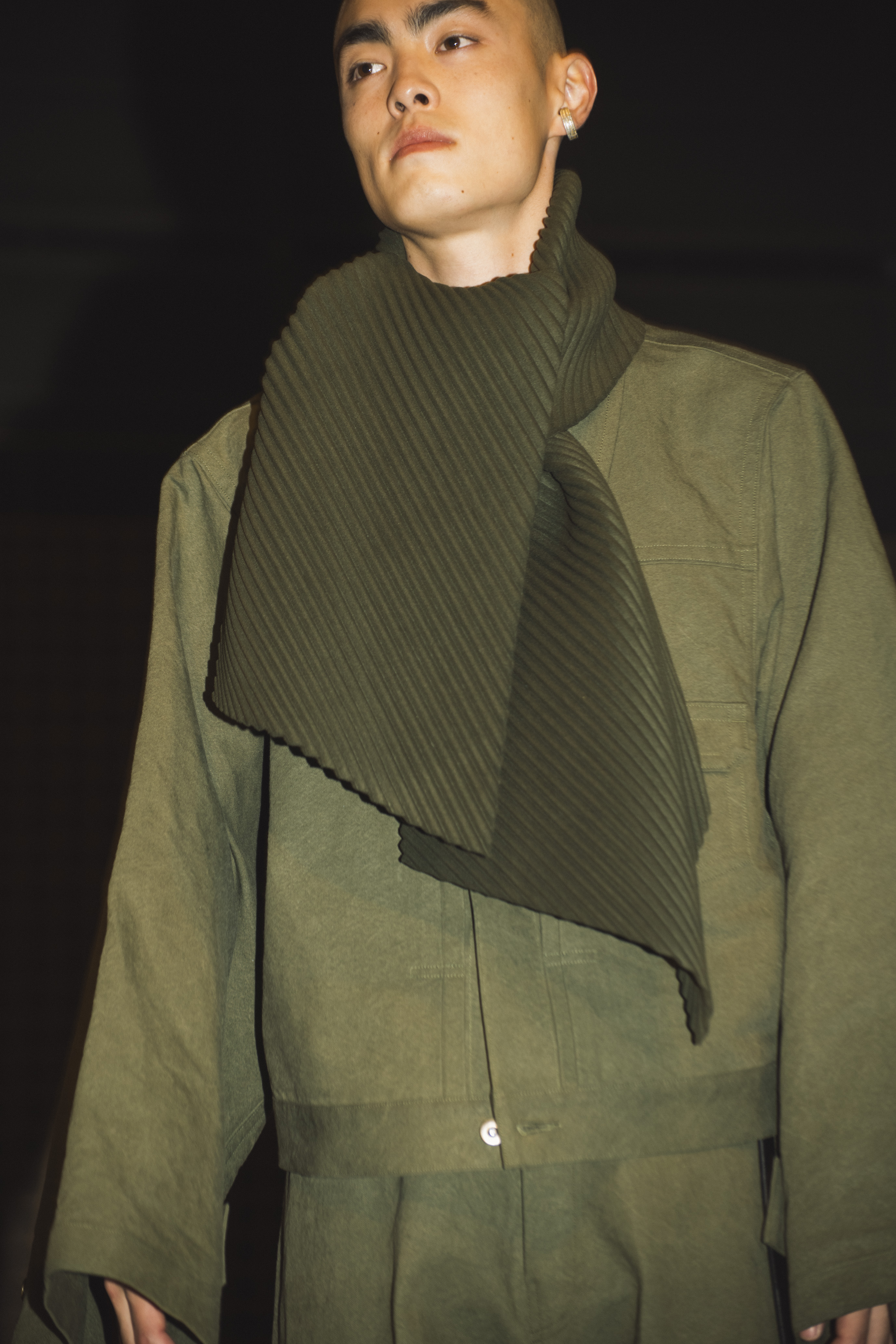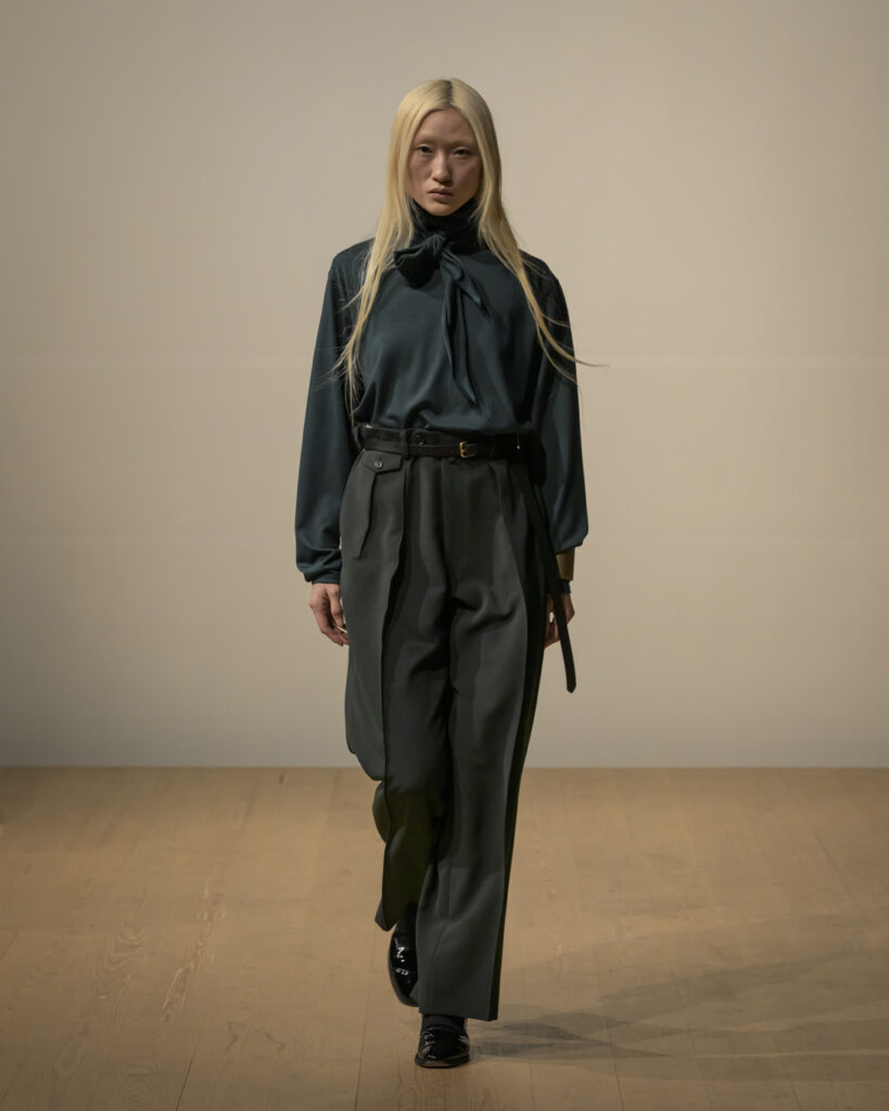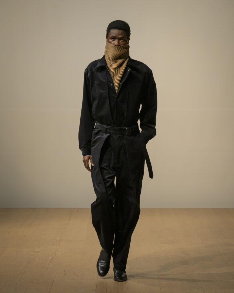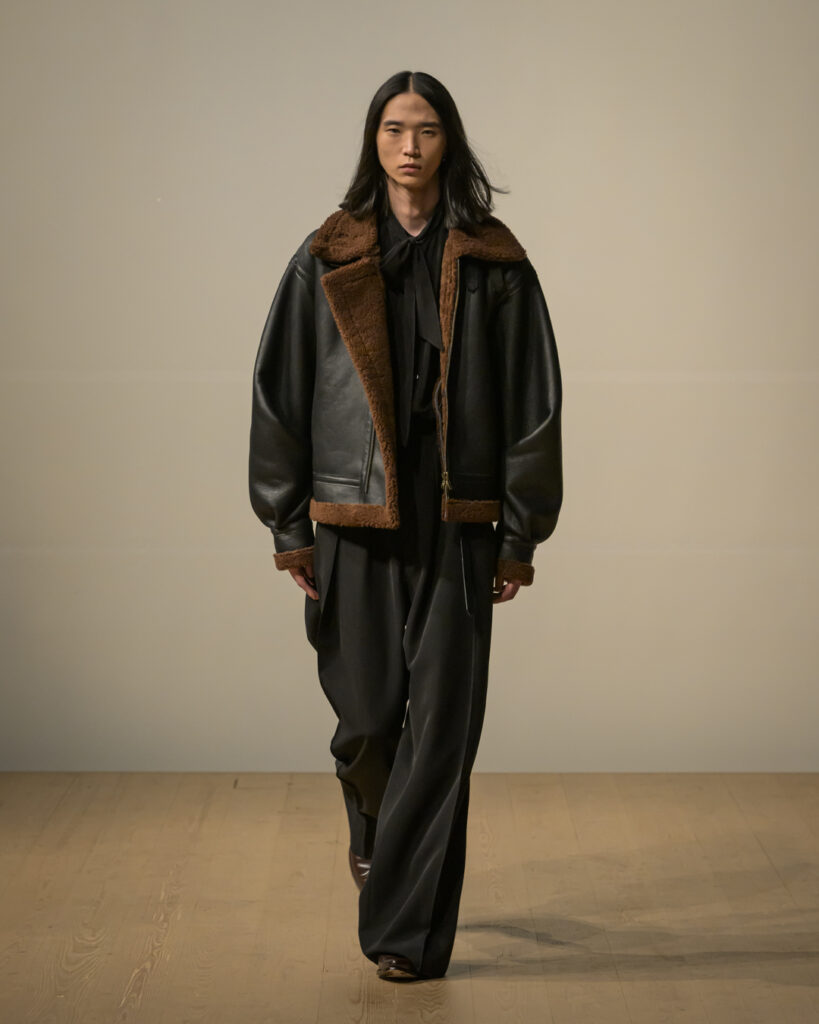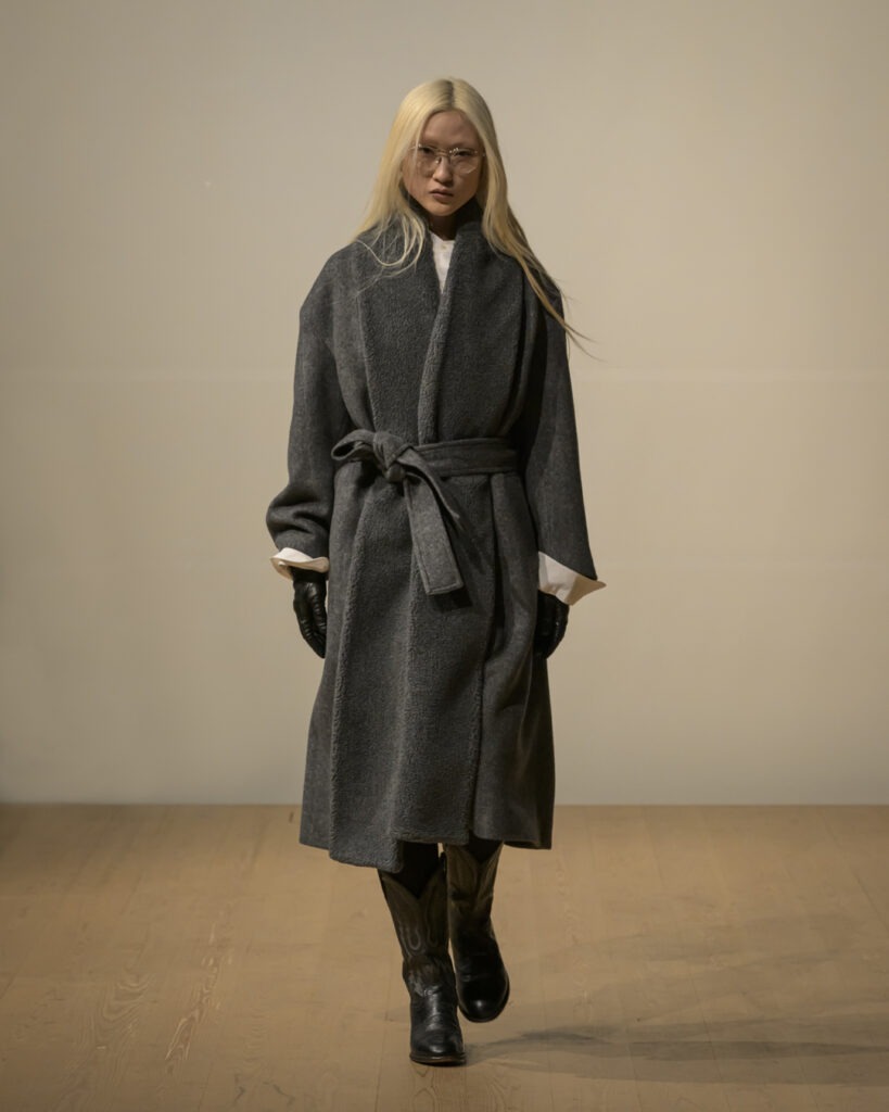 素材選びでは、光を反射するサテンやレザーと、光を吸収するウールやモールスキン、メルトンを対比させ、「光の反射」と「闇の吸収」を表現。透過性のある布地は障子越しの柔らかな光の陰影を衣服に落とし込んでいる。さらに造形においては、プリーツやタックによる深い影や、透過布の重ねによる「奥行きの影」を生み出し、直線裁ちの静けさとバロック衣装に通じる豊かなドレープを対比させることで「静」と「動」、「内」と「外」の共生を追求した。