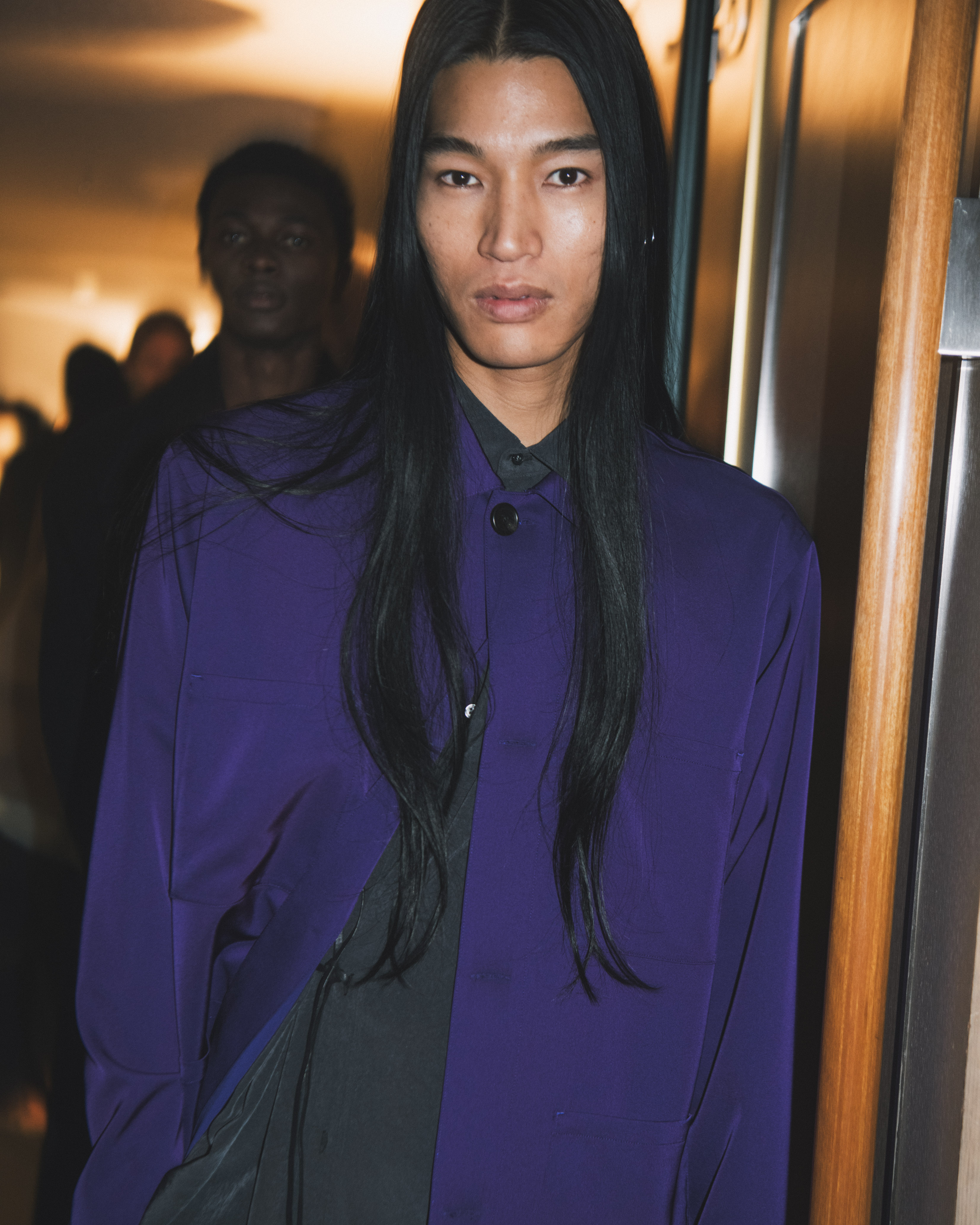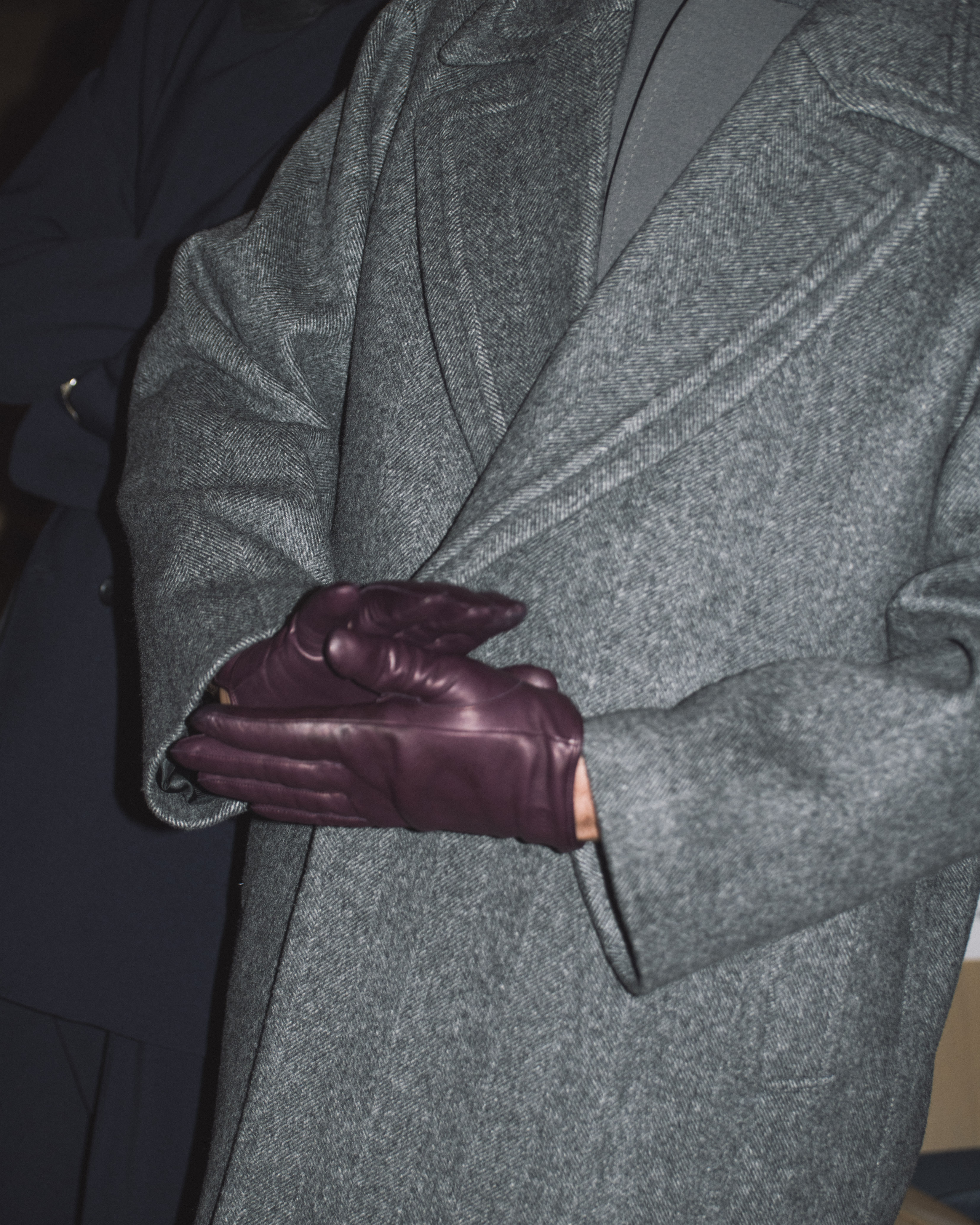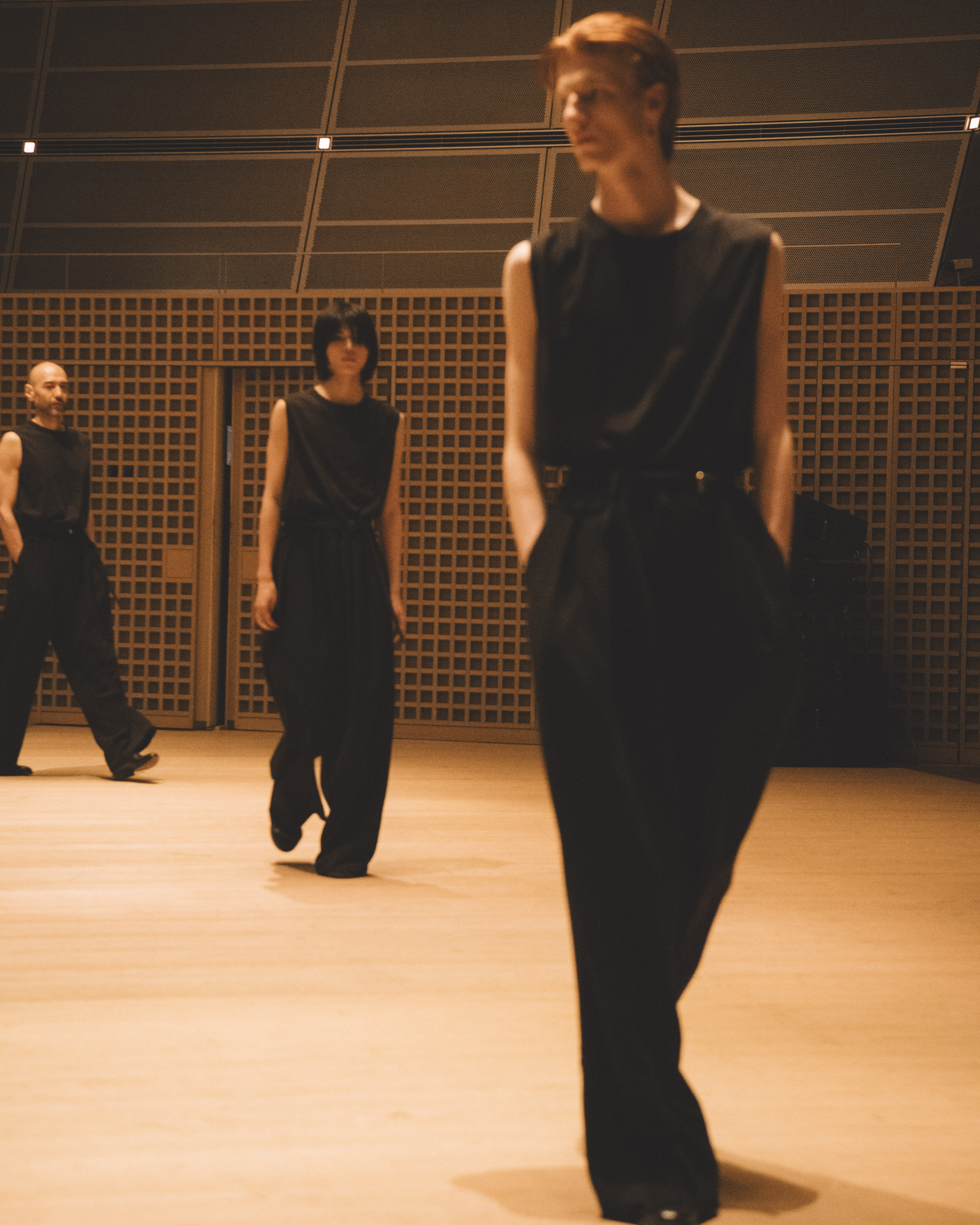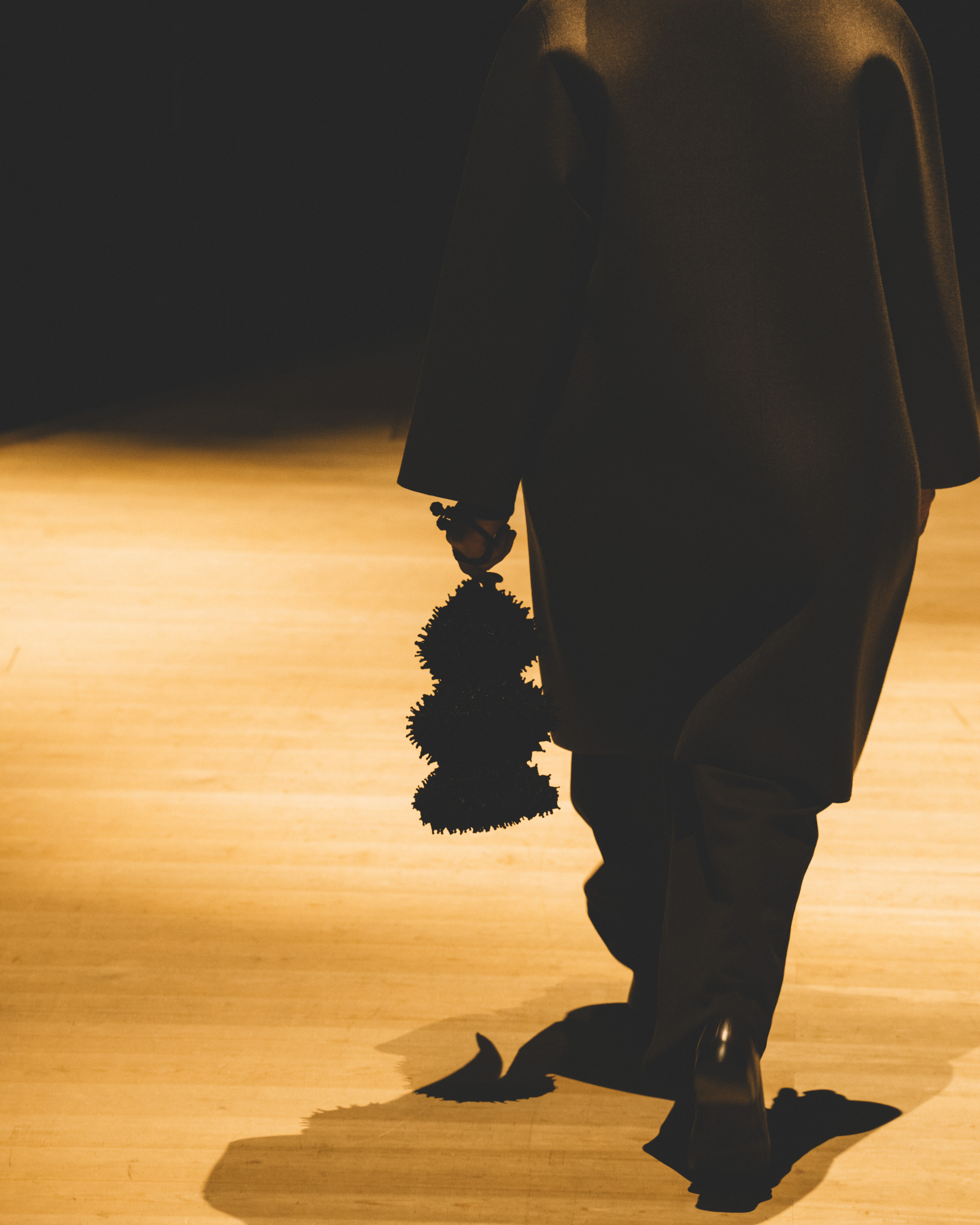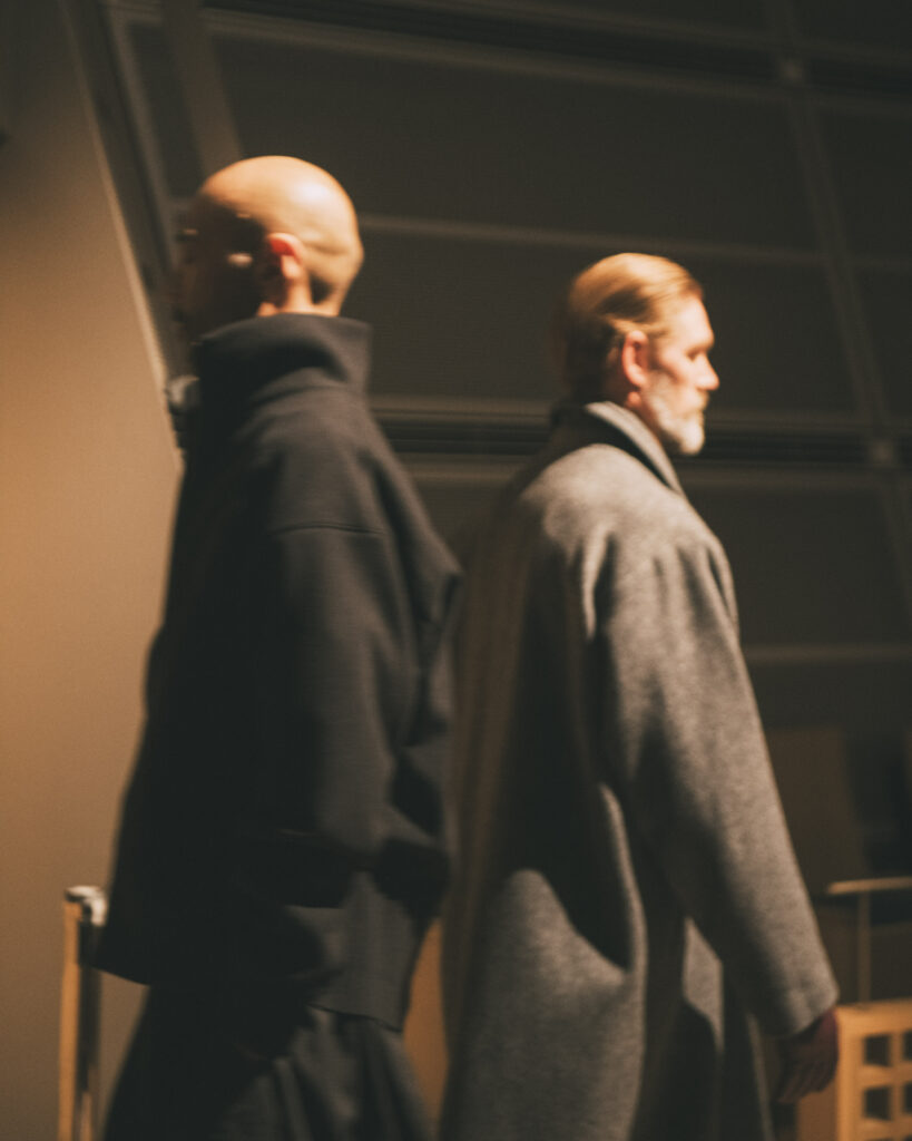 素材選びでは、光を反射するサテンやレザーと、光を吸収するウールやモールスキン、メルトンを対比させ、「光の反射」と「闇の吸収」を表現。透過性のある布地は障子越しの柔らかな光の陰影を衣服に落とし込んでいる。さらに造形においては、プリーツやタックによる深い影や、透過布の重ねによる「奥行きの影」を生み出し、直線裁ちの静けさとバロック衣装に通じる豊かなドレープを対比させることで「静」と「動」、「内」と「外」の共生を追求した。